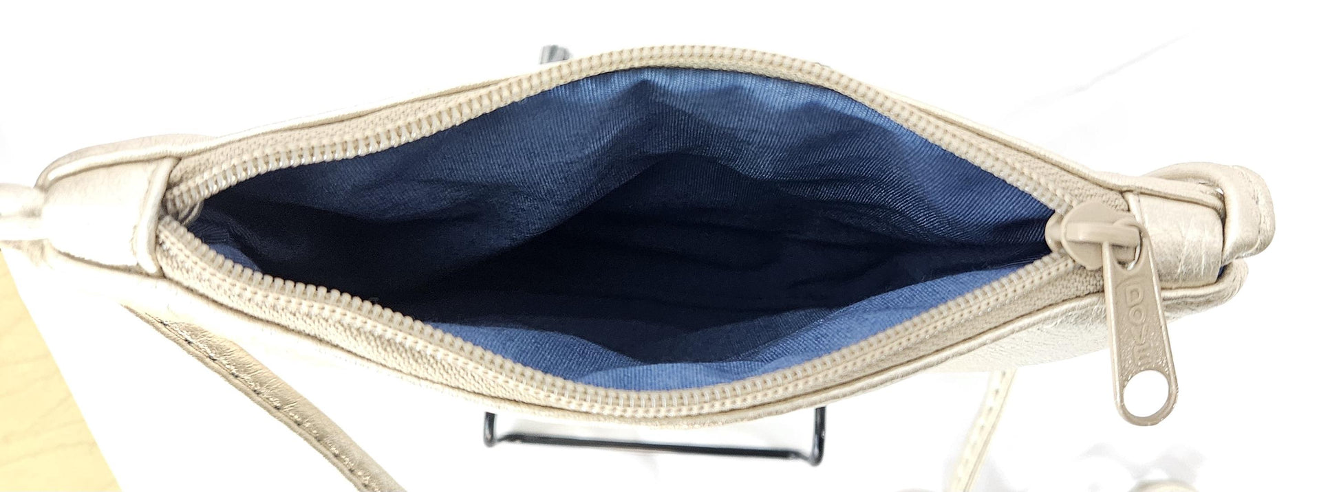 Beige Metallic Leather Crossbody Bag: Gold Accent, Made in USA